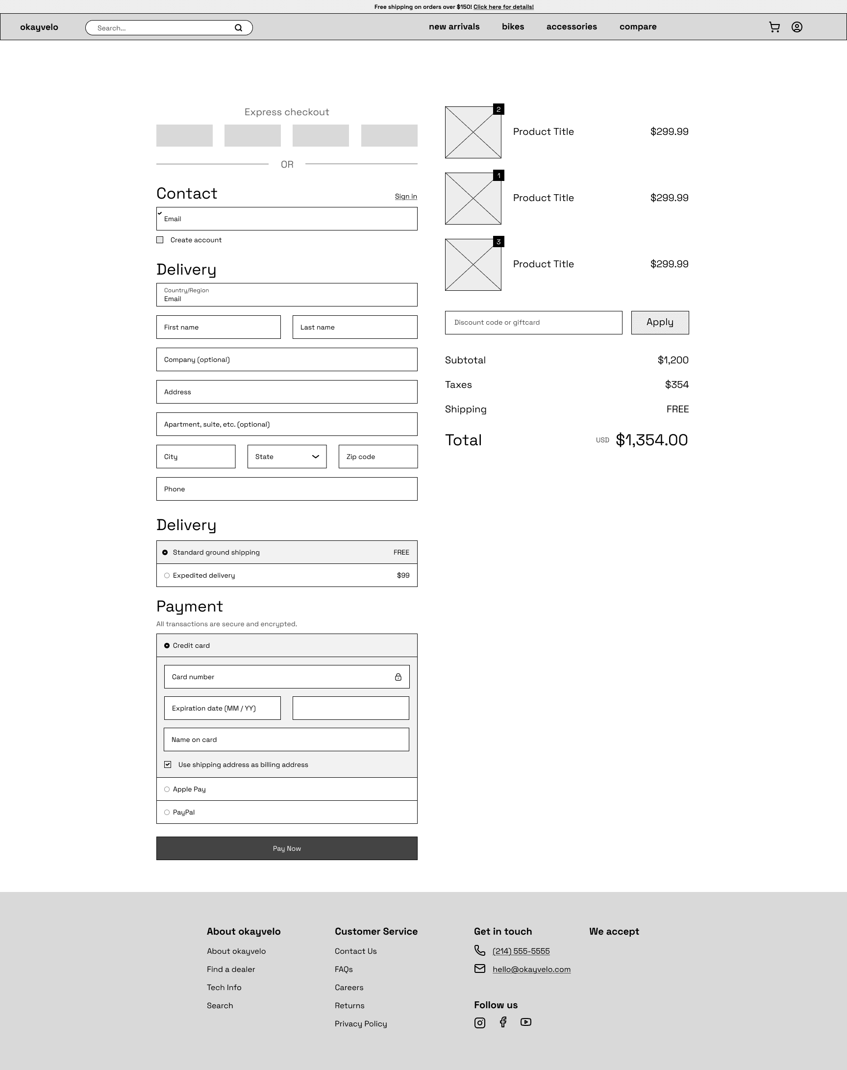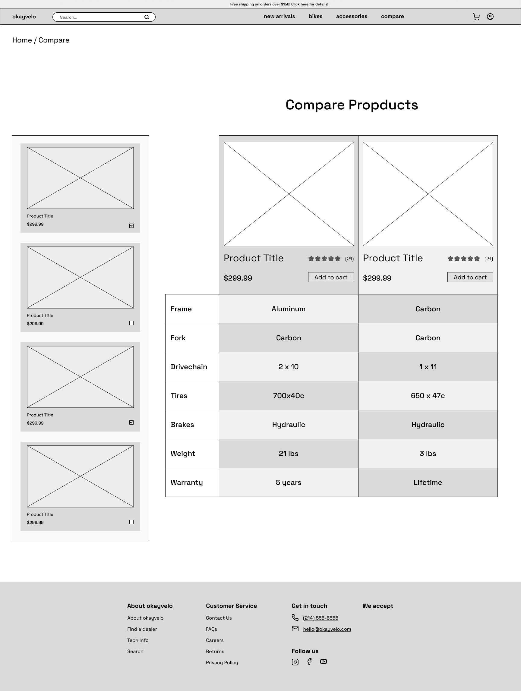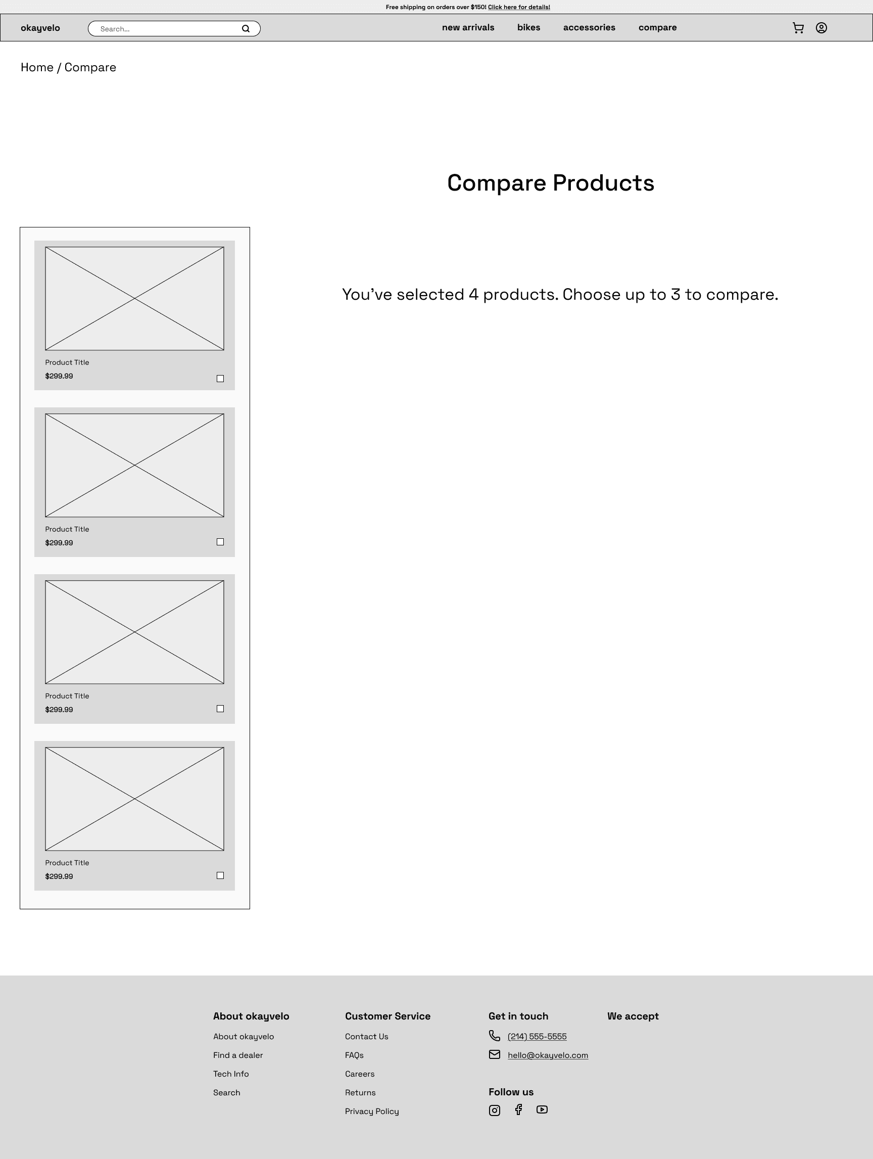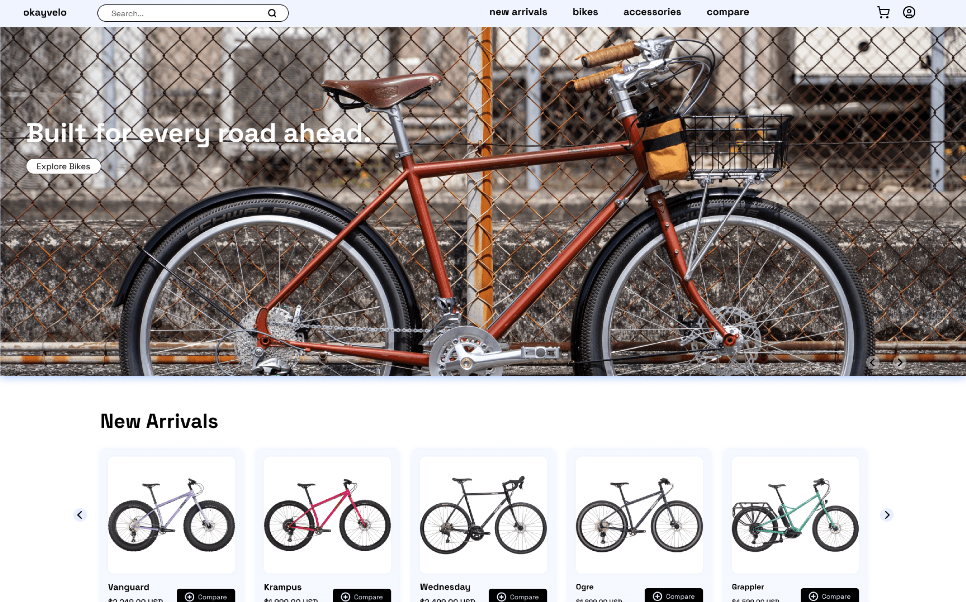 okayvelo is a desktop e-commerce experience that helps riders browse, compare, and buy bikes with confidence. I designed the flow end-to-end with a focus on adding a side-by-side compare feature and improving perceived security during checkout to reduce friction and increase conversion.