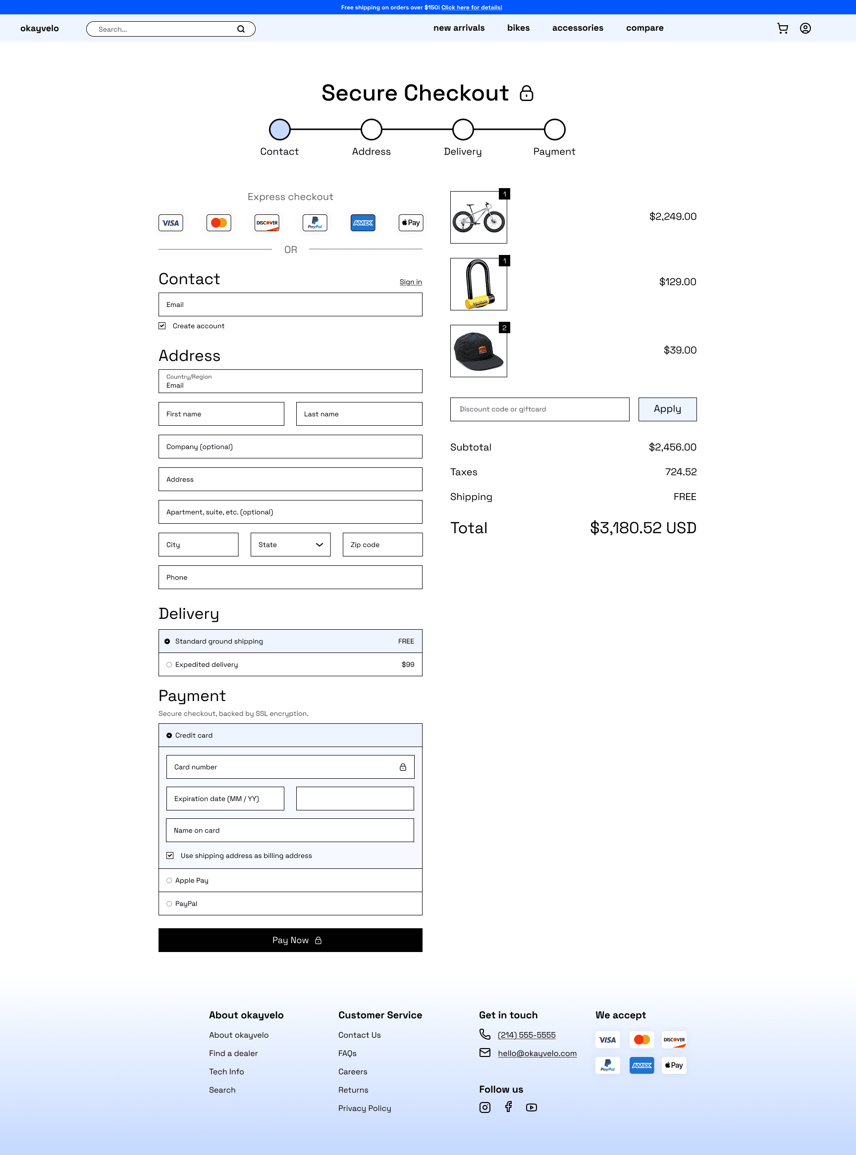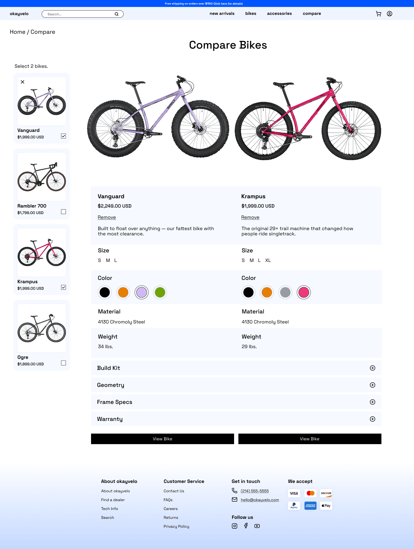 okayvelo introduces a side-by-side bike comparison and a guest checkout with visible security cues, helping riders make confident decisions and reducing cart abandonment
