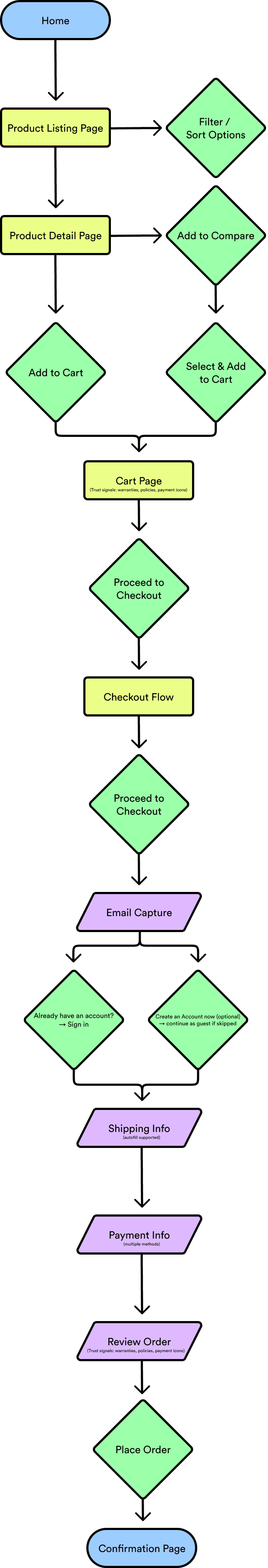 Competitive Analysis – Documented purchase flows from Trek, Amazon, and Target, noting where they supported product comparison, how they structured checkout, and which trust signals they emphasized.