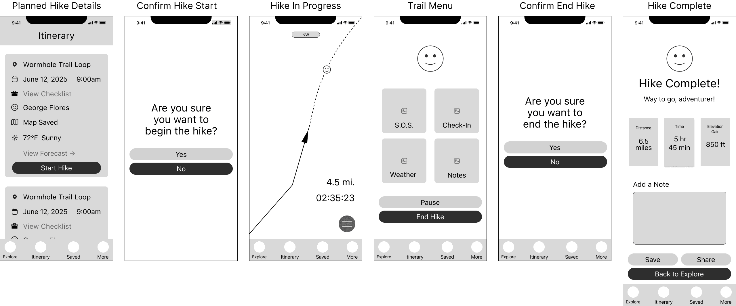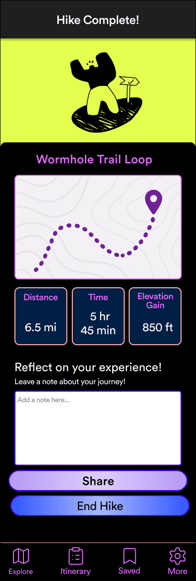 After two rounds of usability testing and iterative design, TrailBuddy delivers a streamlined, safety-first experience for solo hikers. By combining planning, safety, and reflection tools into one app, the final design solves the core challenges uncovered in research.