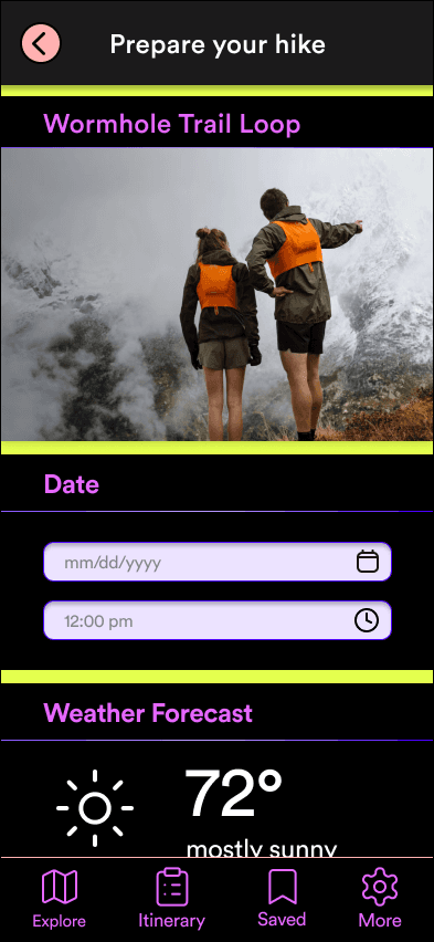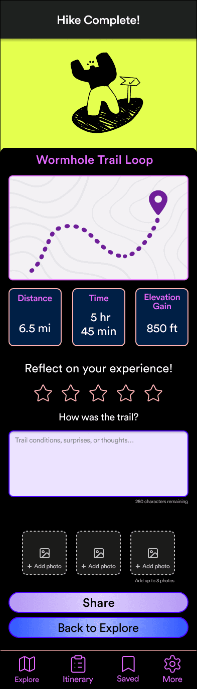 If I could take this project further, I’d test TrailBuddy in real outdoor environments to validate its usability beyond the controlled prototype. I’d also explore adding community-driven features, such as shared trail tips and photos, while maintaining the solo-hiker focus.