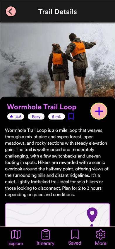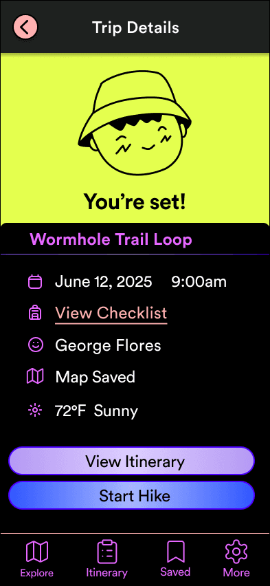 TrailBuddy’s visual design balances clarity with personality, using typography and color to create an experience that feels both supportive and energizing for solo hikers.