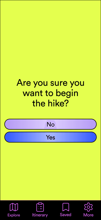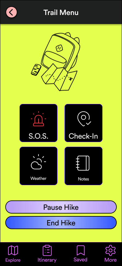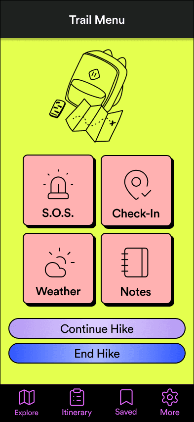 The TrailBuddy palette was inspired by the energy and vibrancy of outdoor adventure. Bright, bold tones were chosen to reflect the fun, approachable, and energetic spirit of solo hiking, while also ensuring visibility and clarity in outdoor conditions. Unlike muted, earthy palettes often seen in outdoor apps, these colors create a more engaging and motivating experience — encouraging users to feel confident and excited as they prepare for their hikes.
