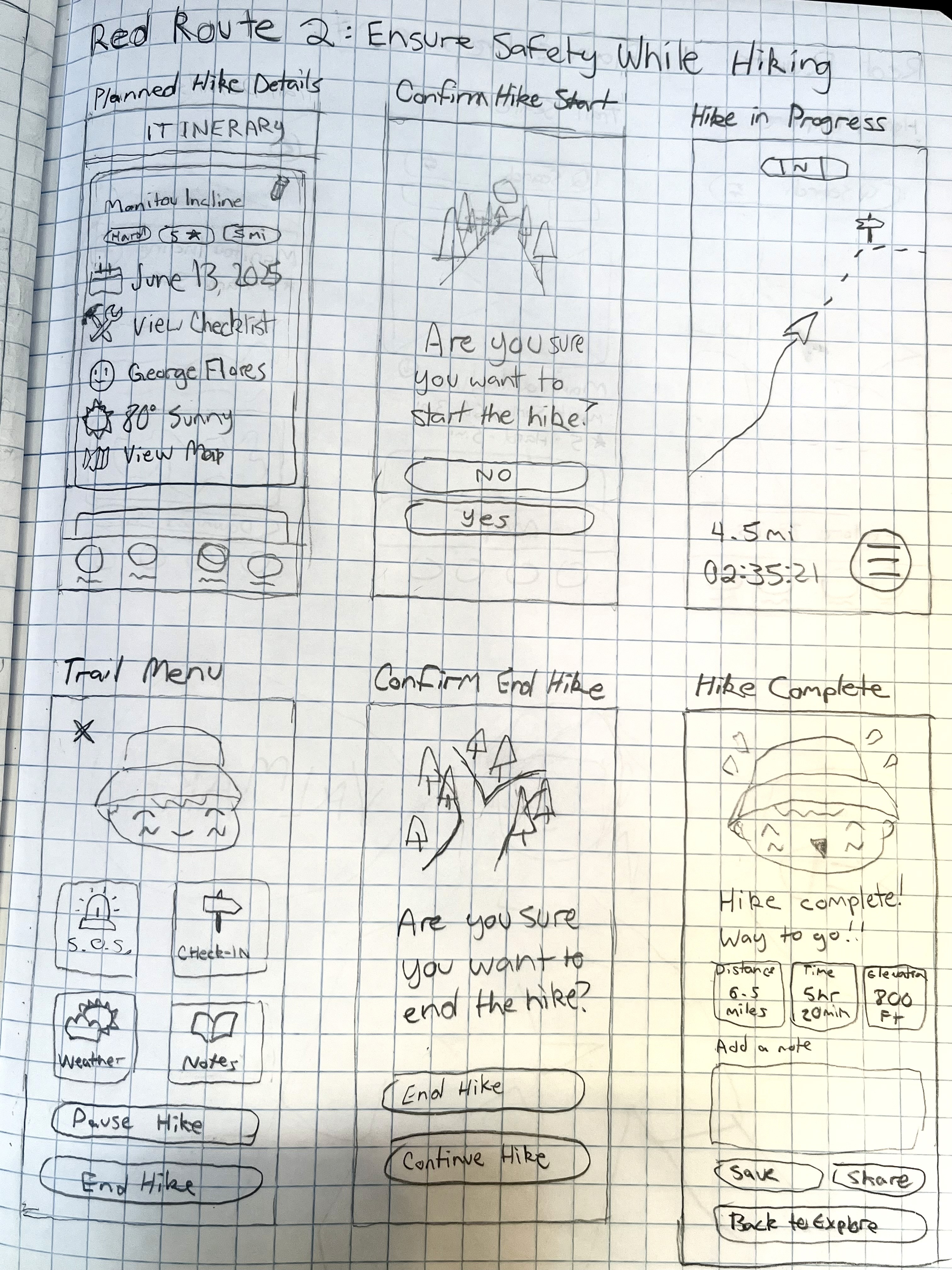 I built the first interactive prototype in Figma, focusing on the core red-route flows: planning a hike and ensuring safety while hiking. My goal was to test whether users could move through these flows intuitively and identify any friction points.